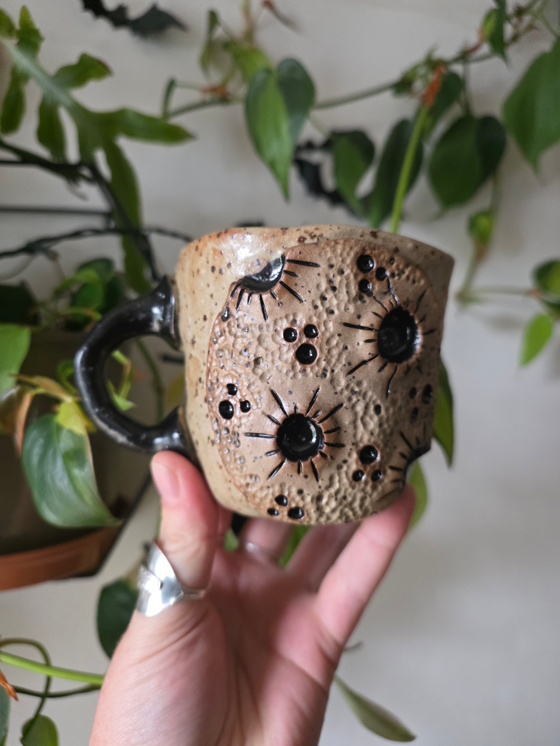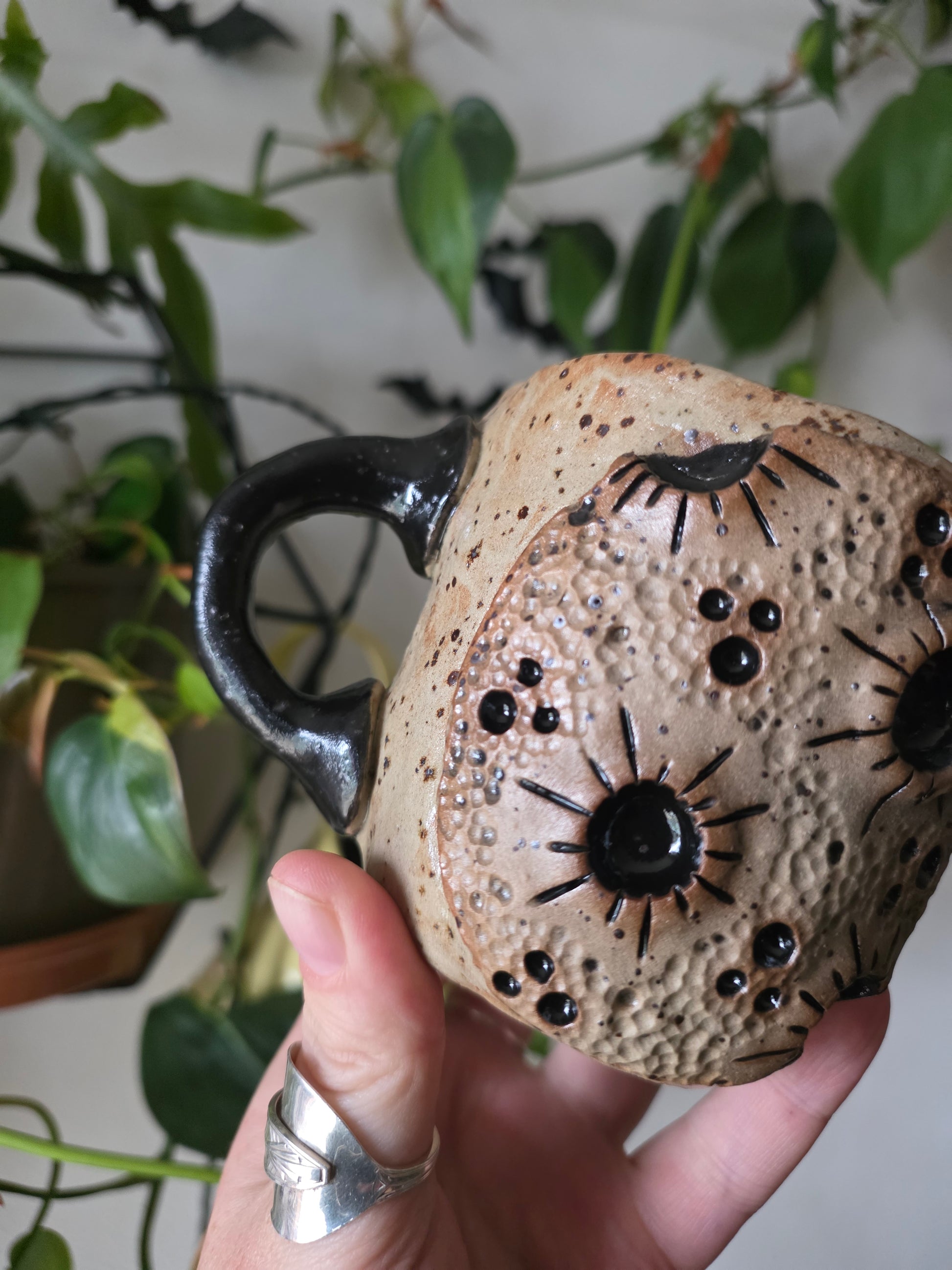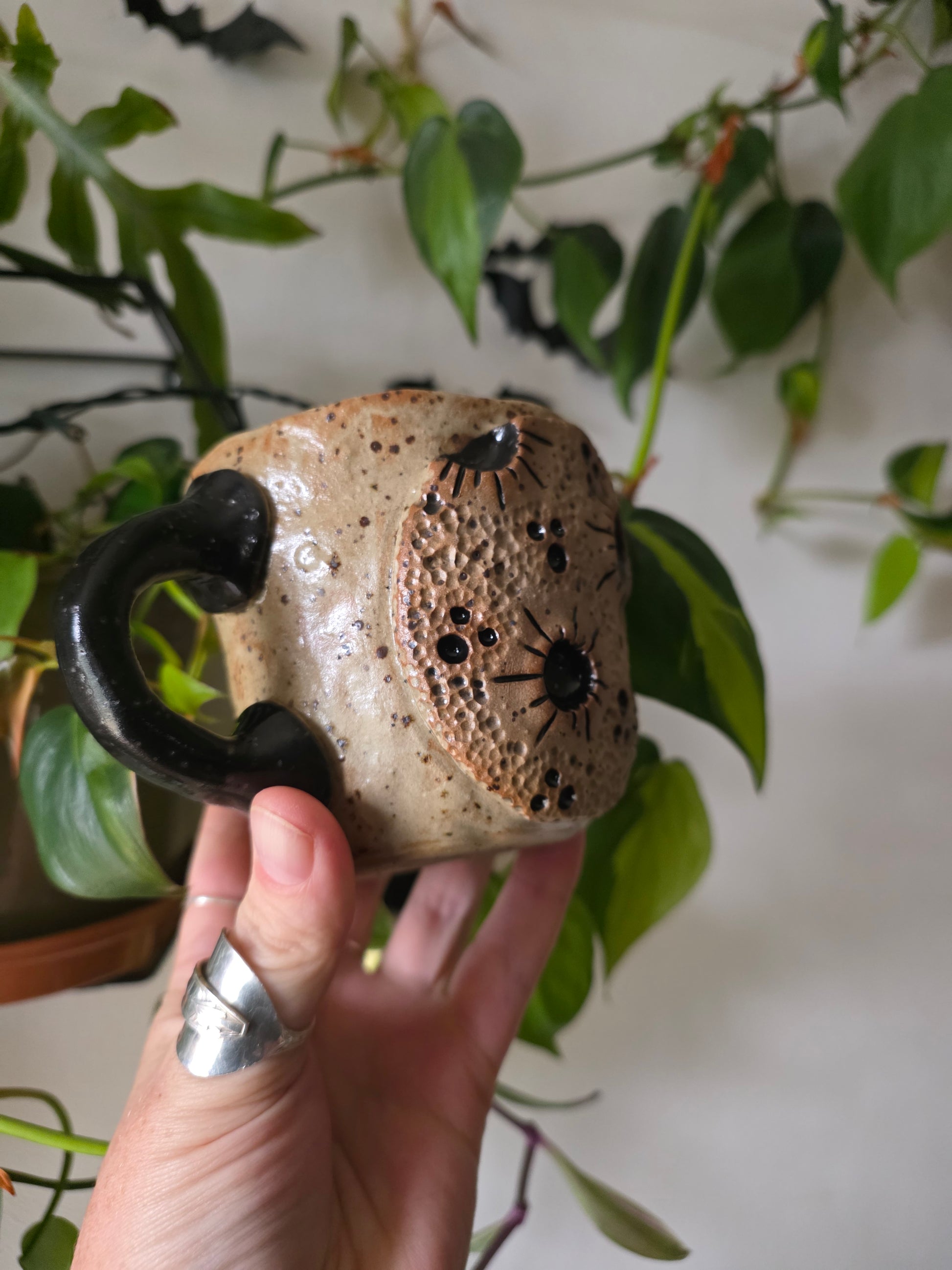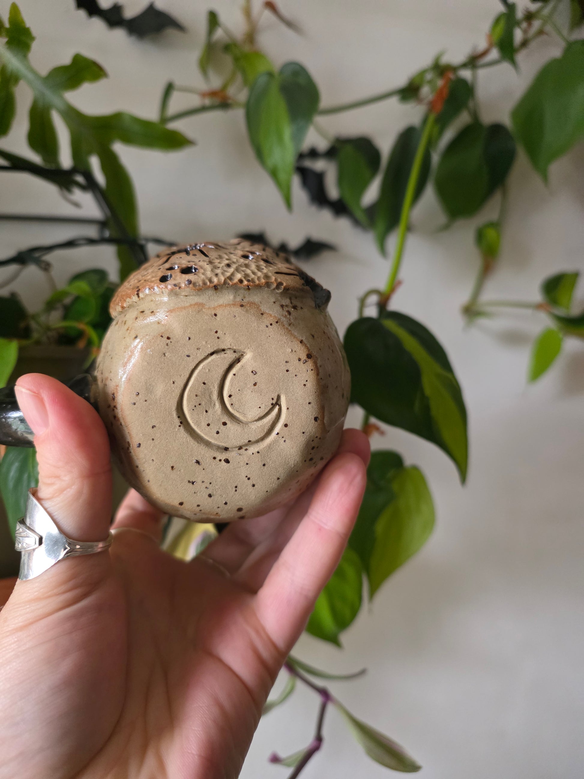 • Hand-made 10oz (Approx.) Mug with Full Moon details, clear glaze outside and inside, black glaze on moon and handle and high-fired to 1260°c •