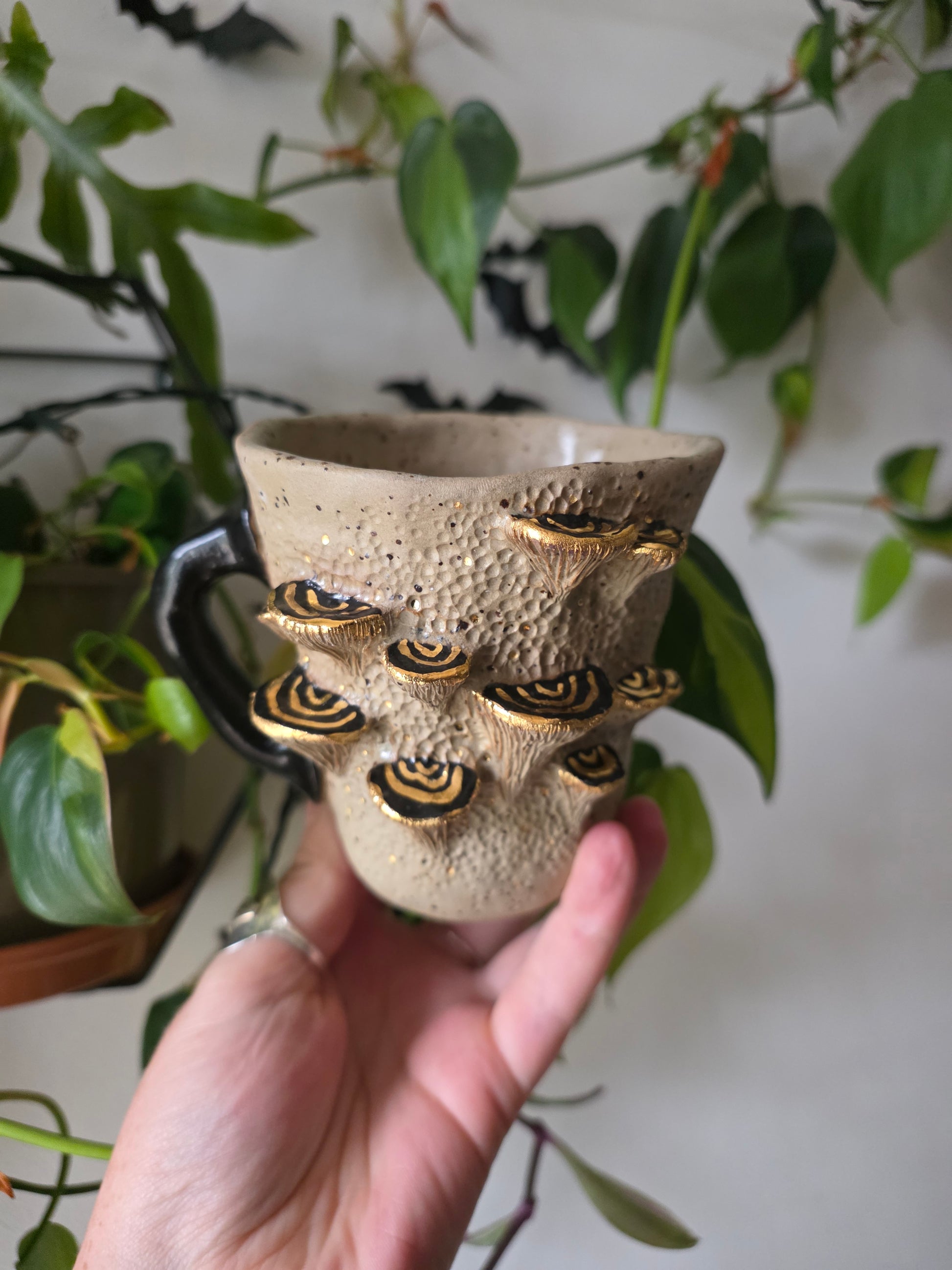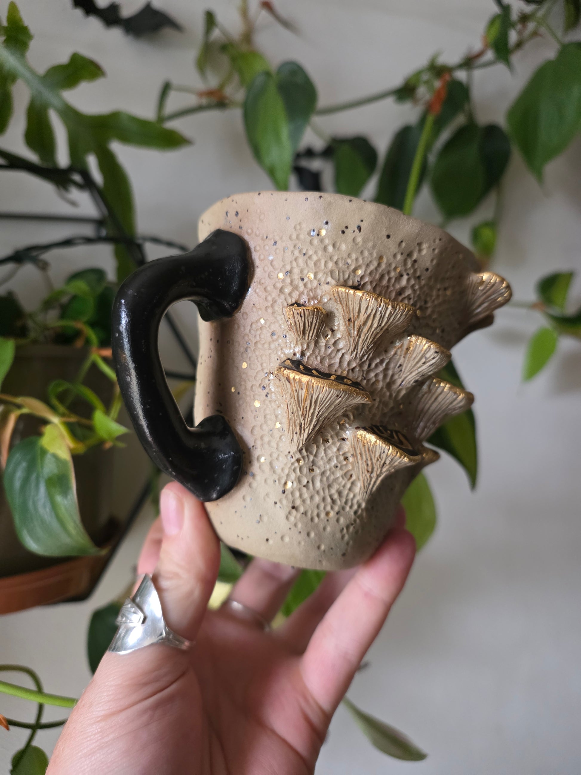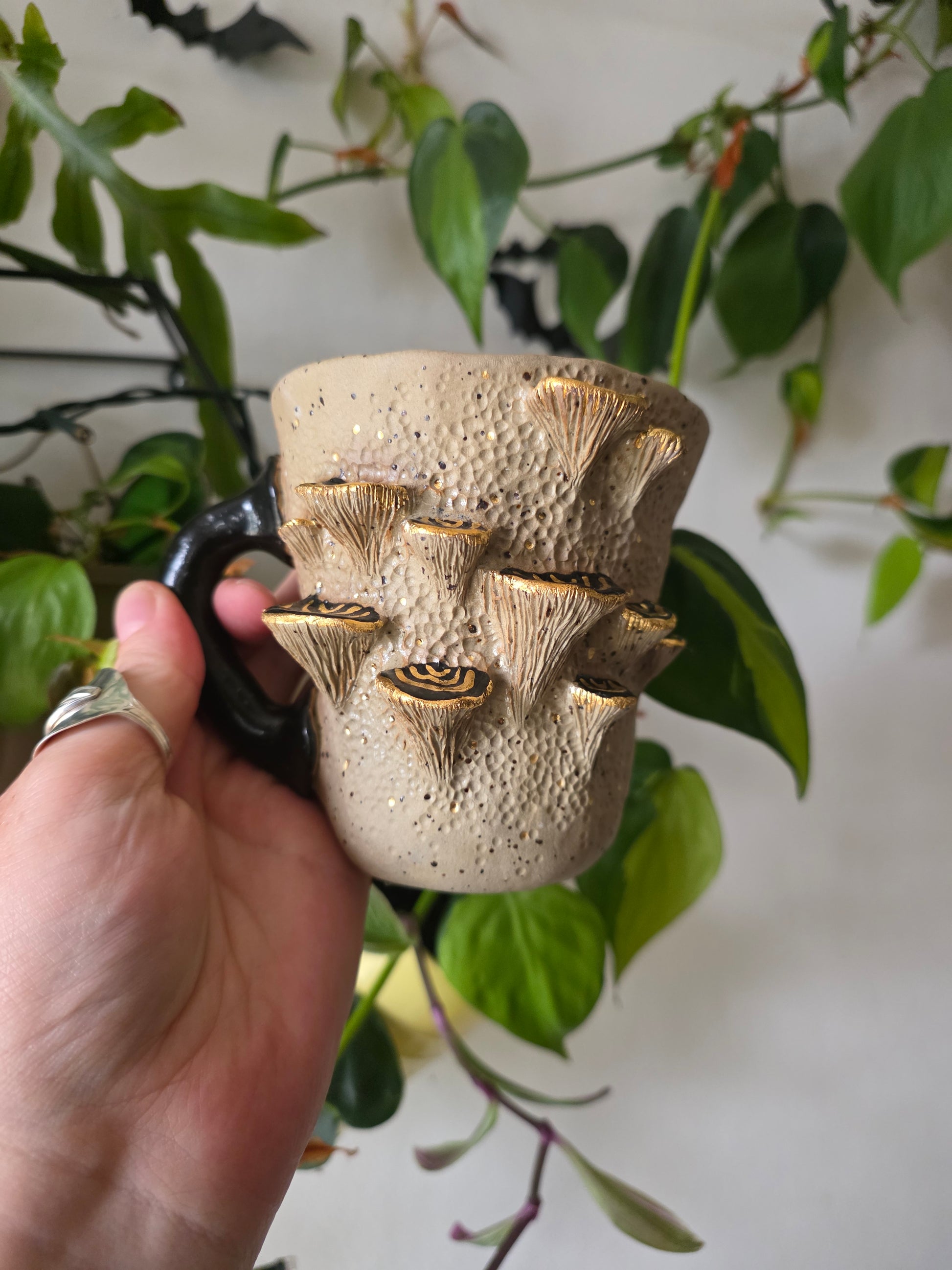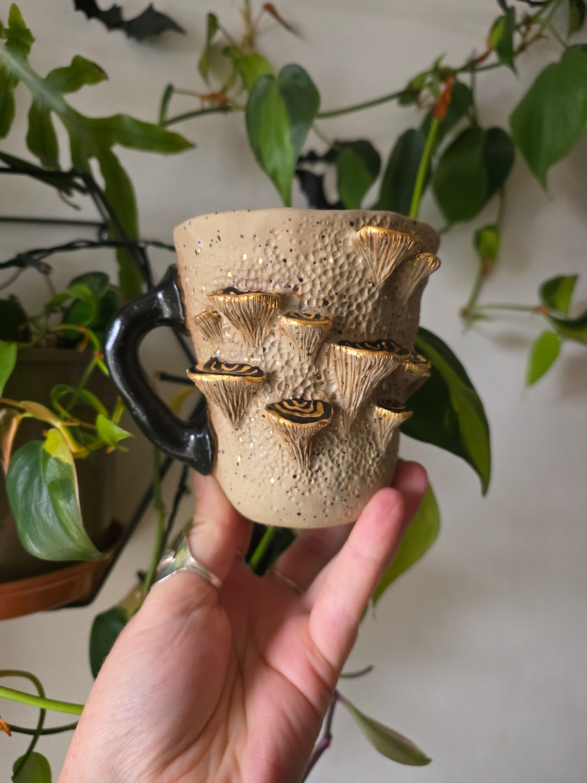 • Hand-made 11oz (Approx.) Mug with Bracket Fungus details, unglazed on outside, clear glaze inside, black glaze on mushrooms and handle and high-fired to 1260°c and finished with 22k gold luster