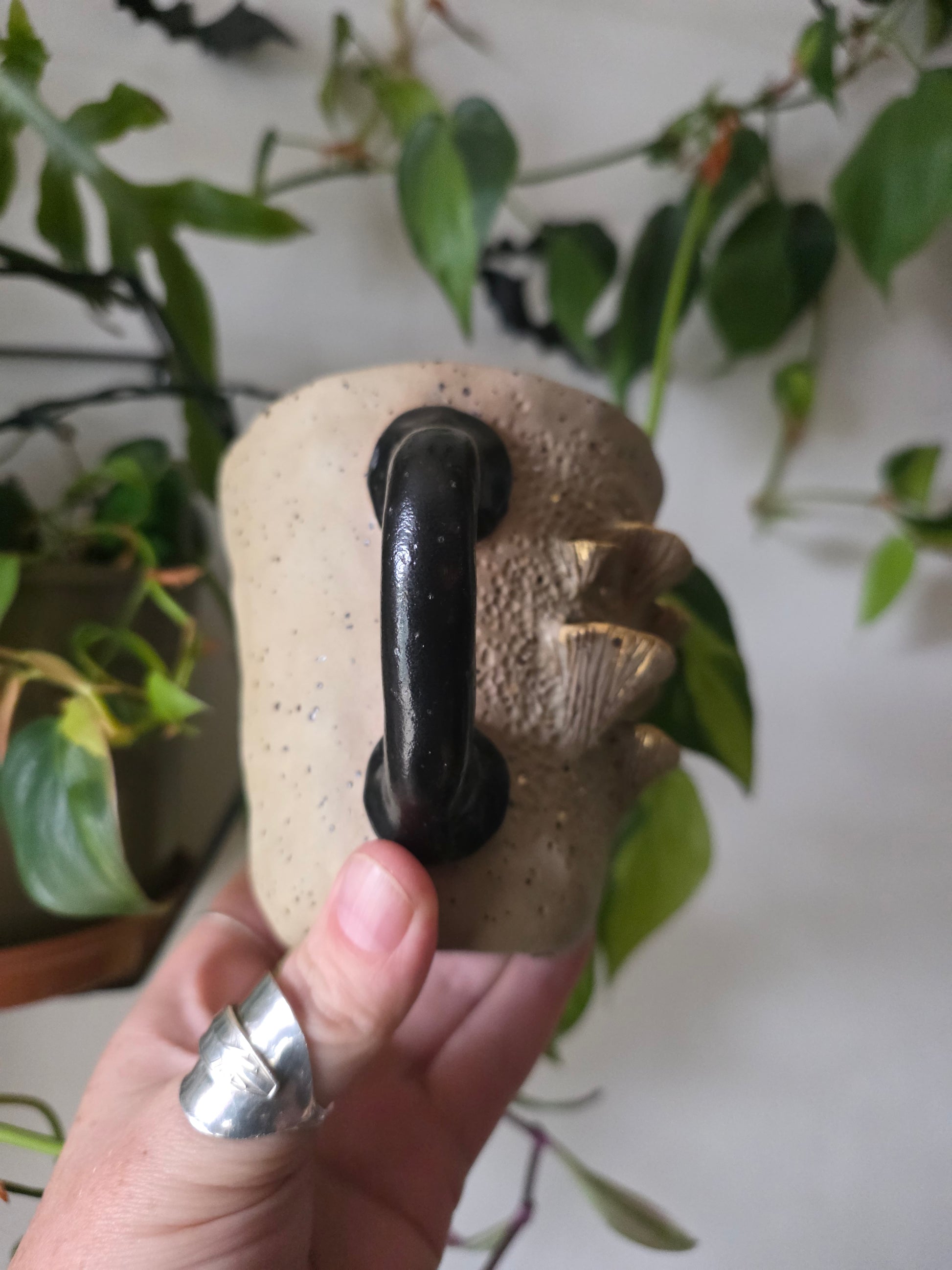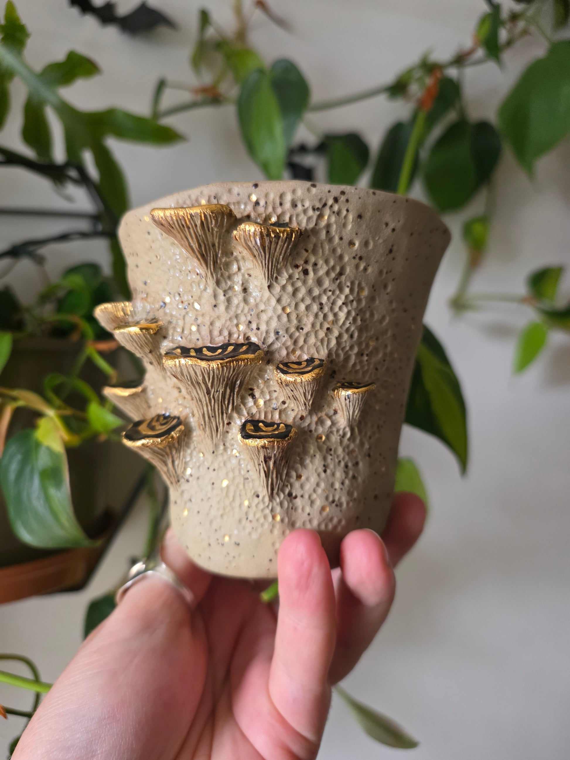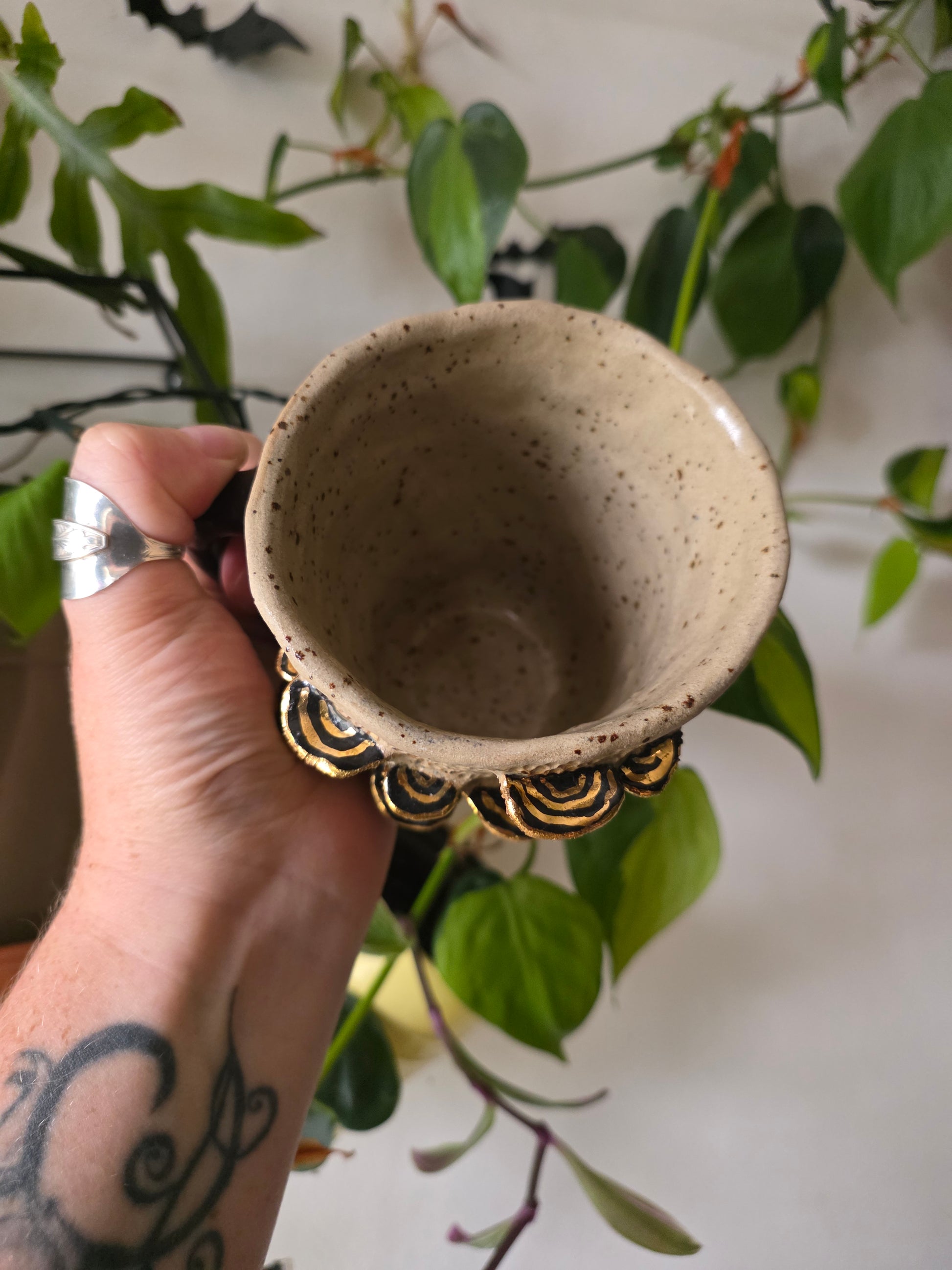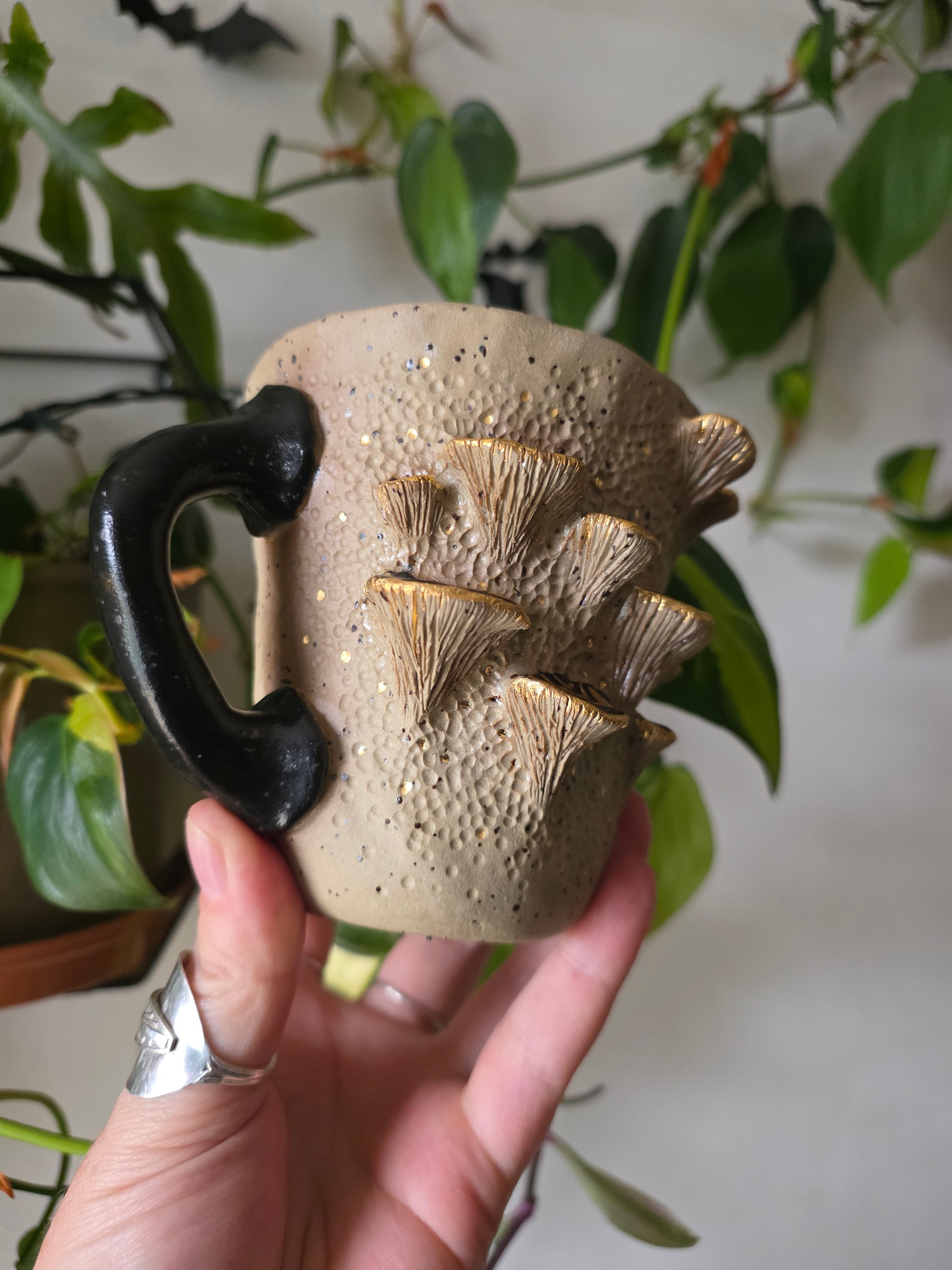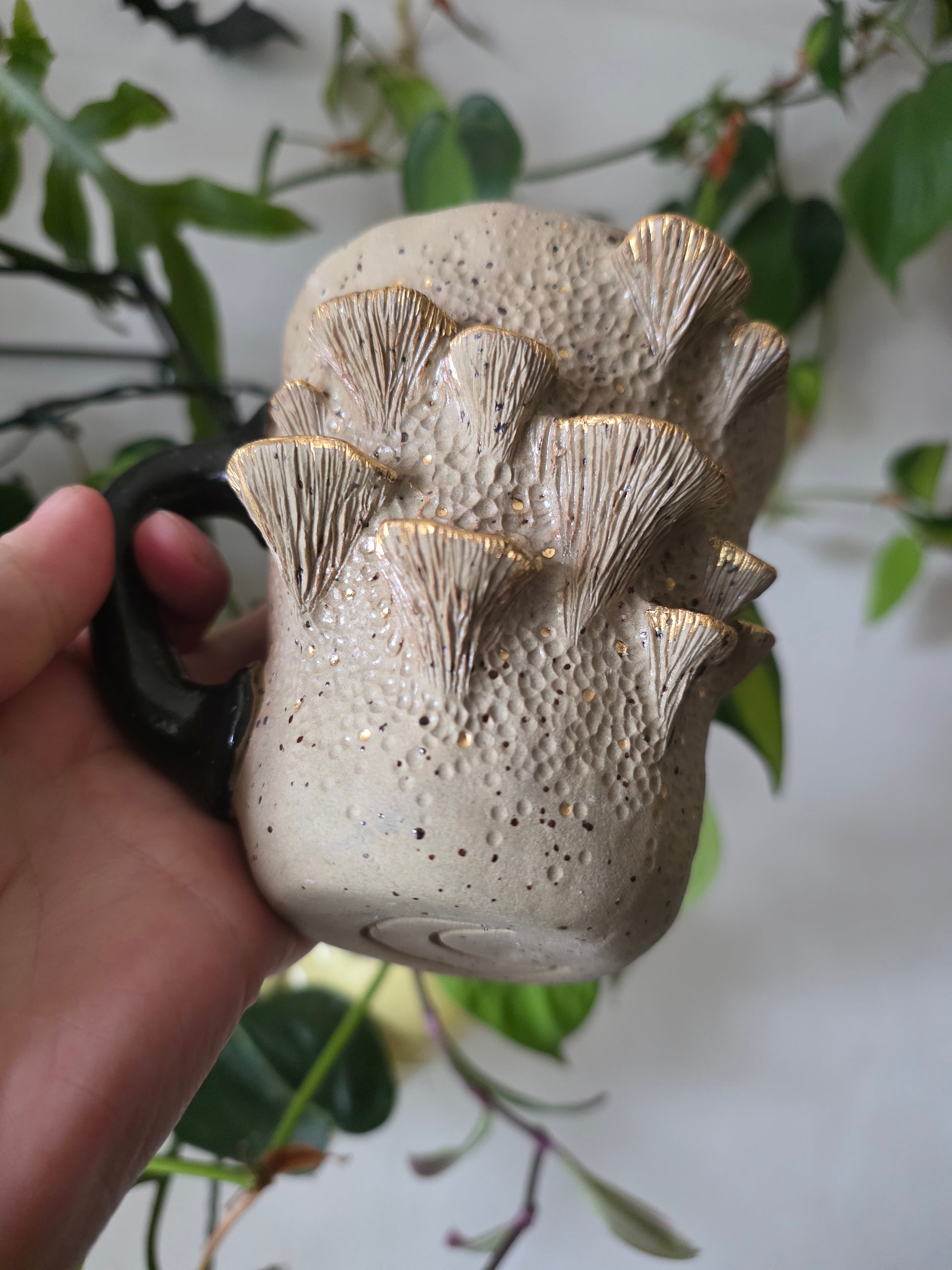 • Hand-made 11oz (Approx.) Mug with Bracket Fungus details, unglazed on outside, clear glaze inside, black glaze on mushrooms and handle and high-fired to 1260°c and finished with 22k gold luster