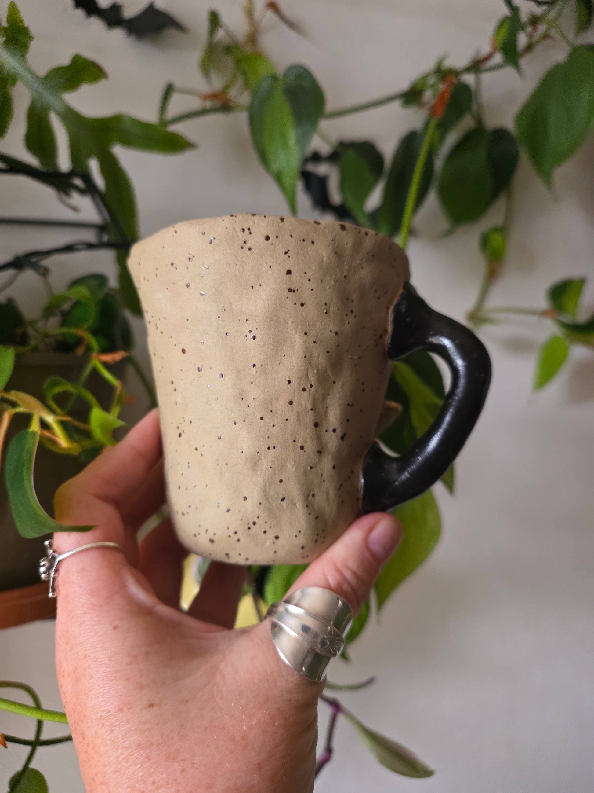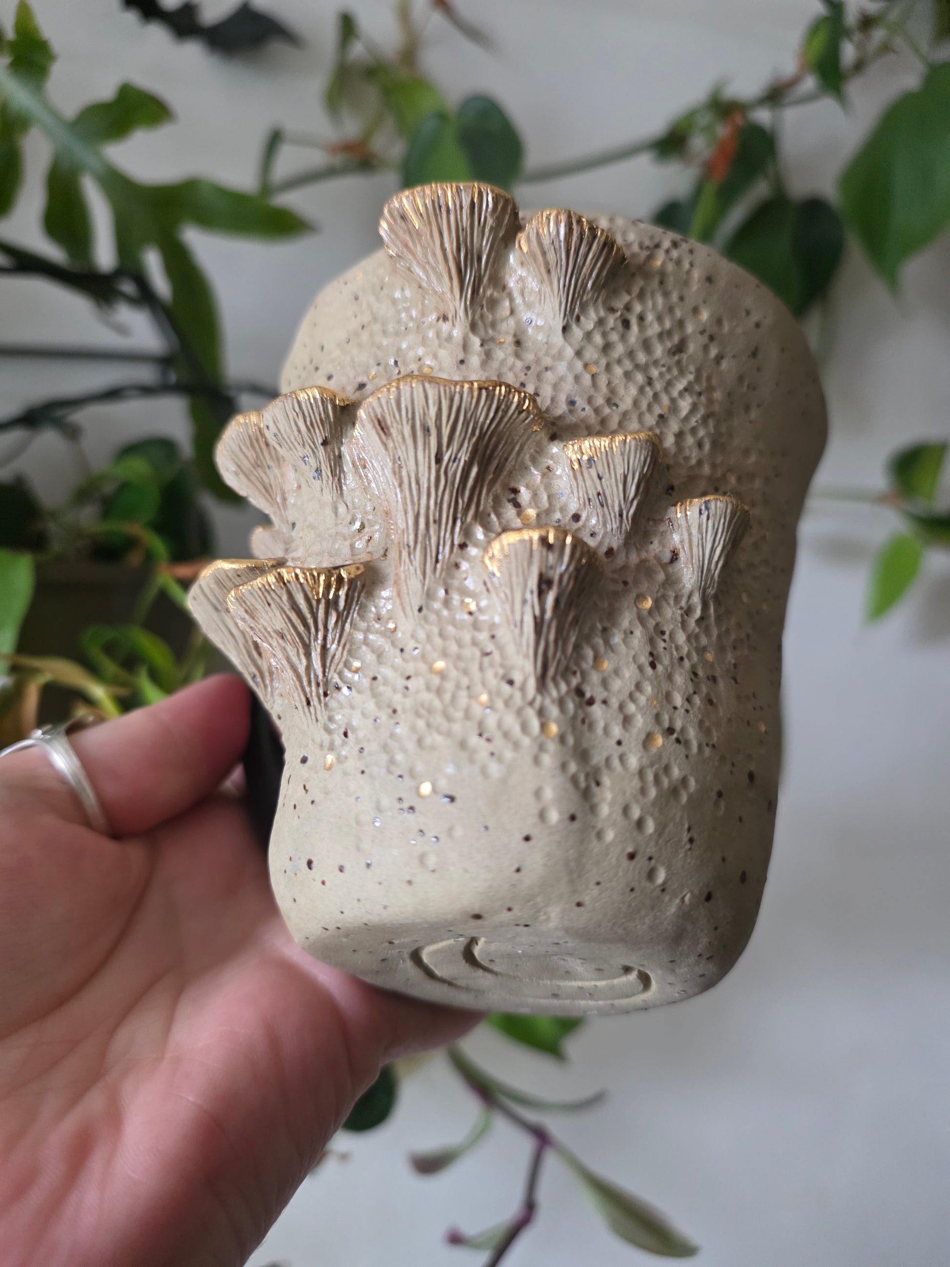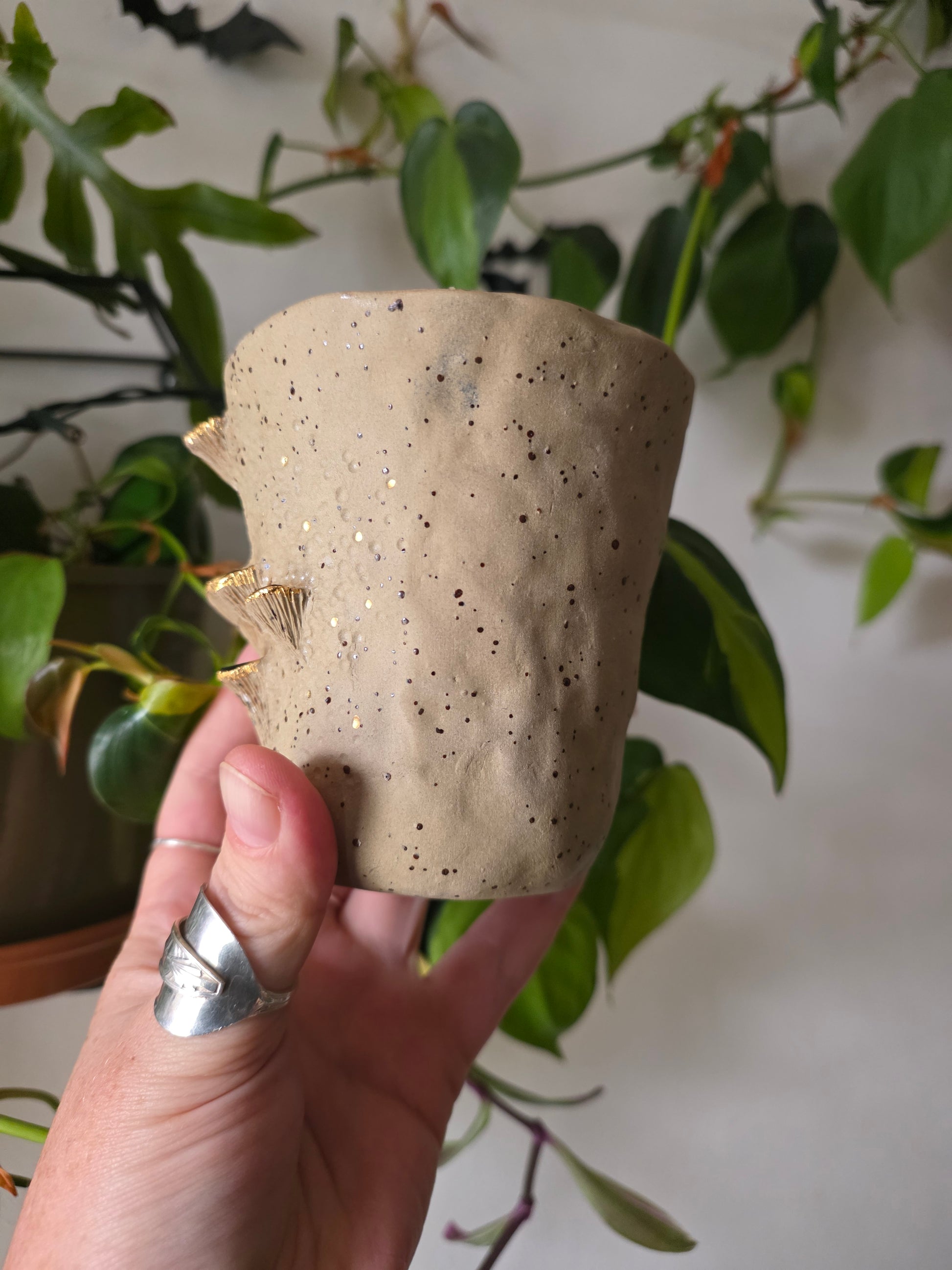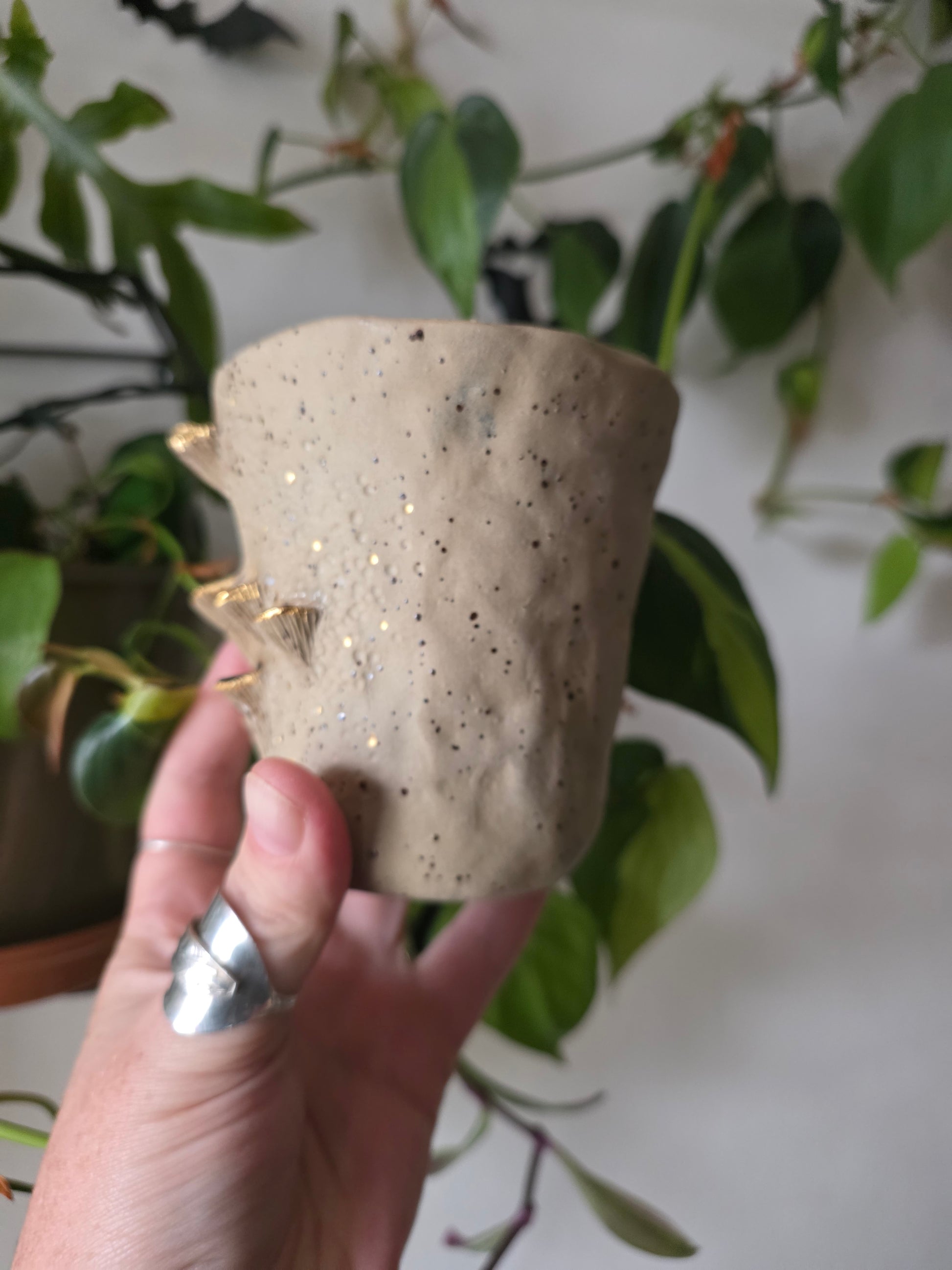 • Hand-made 11oz (Approx.) Mug with Bracket Fungus details, unglazed on outside, clear glaze inside, black glaze on mushrooms and handle and high-fired to 1260°c and finished with 22k gold luster