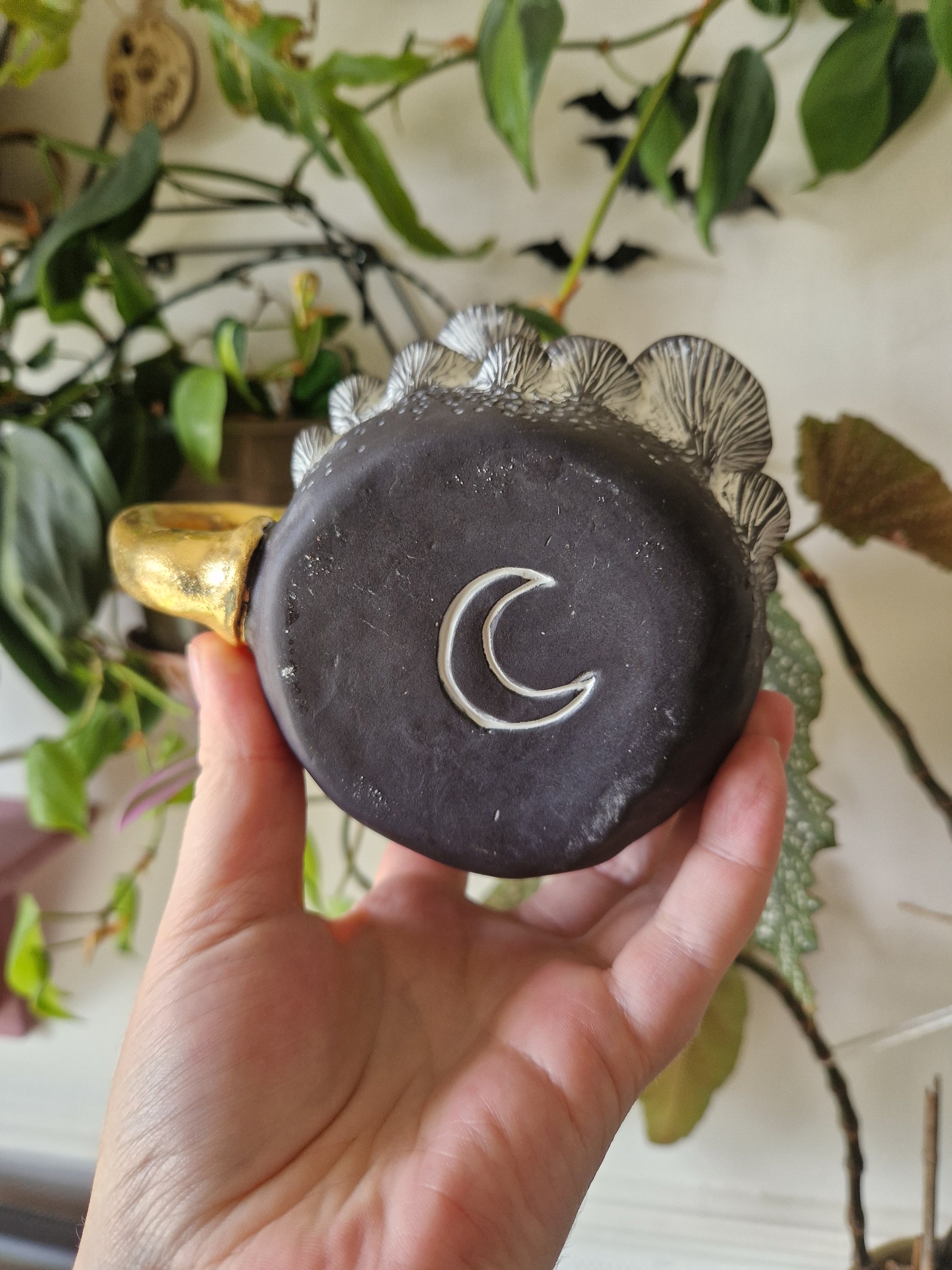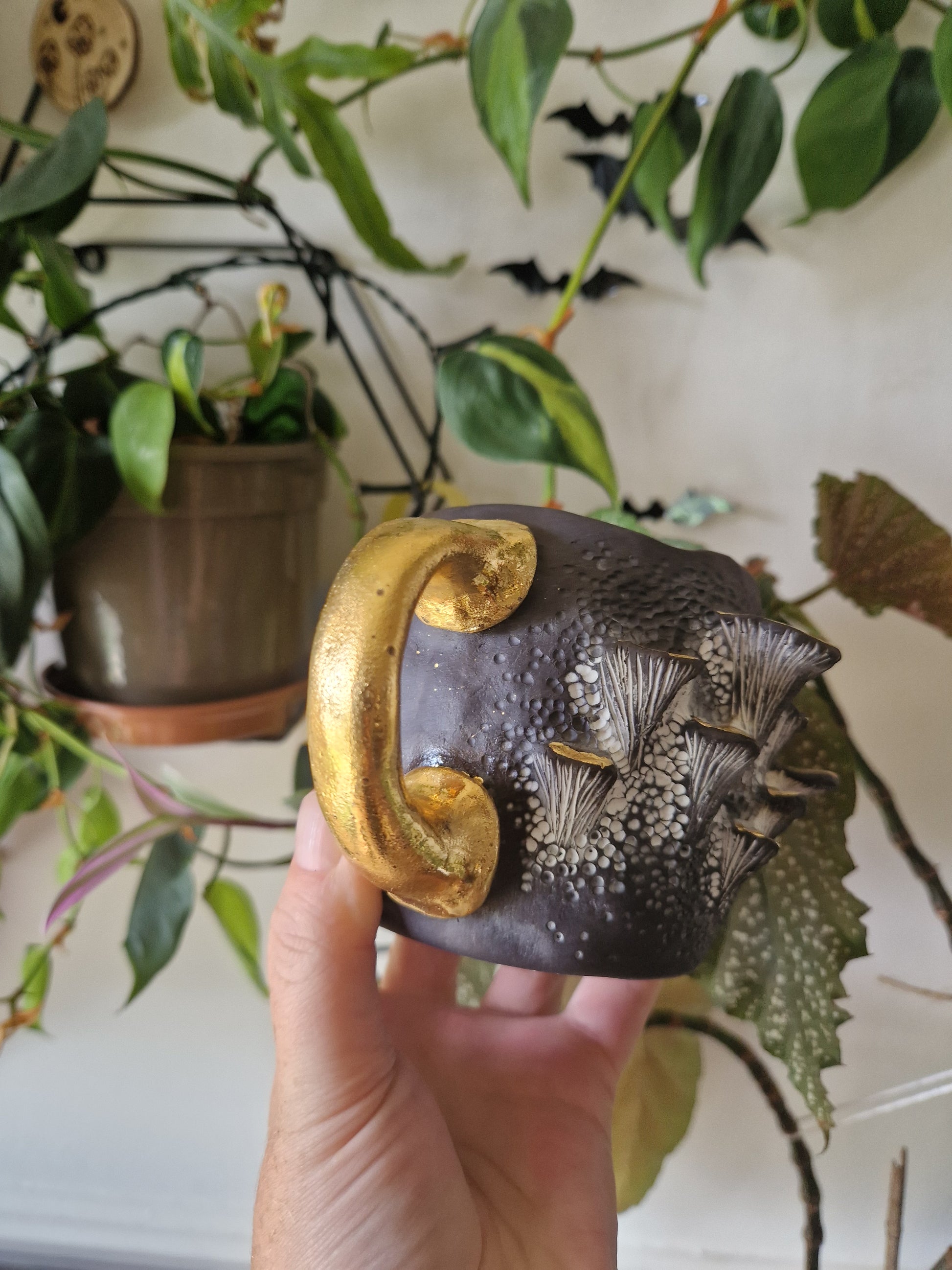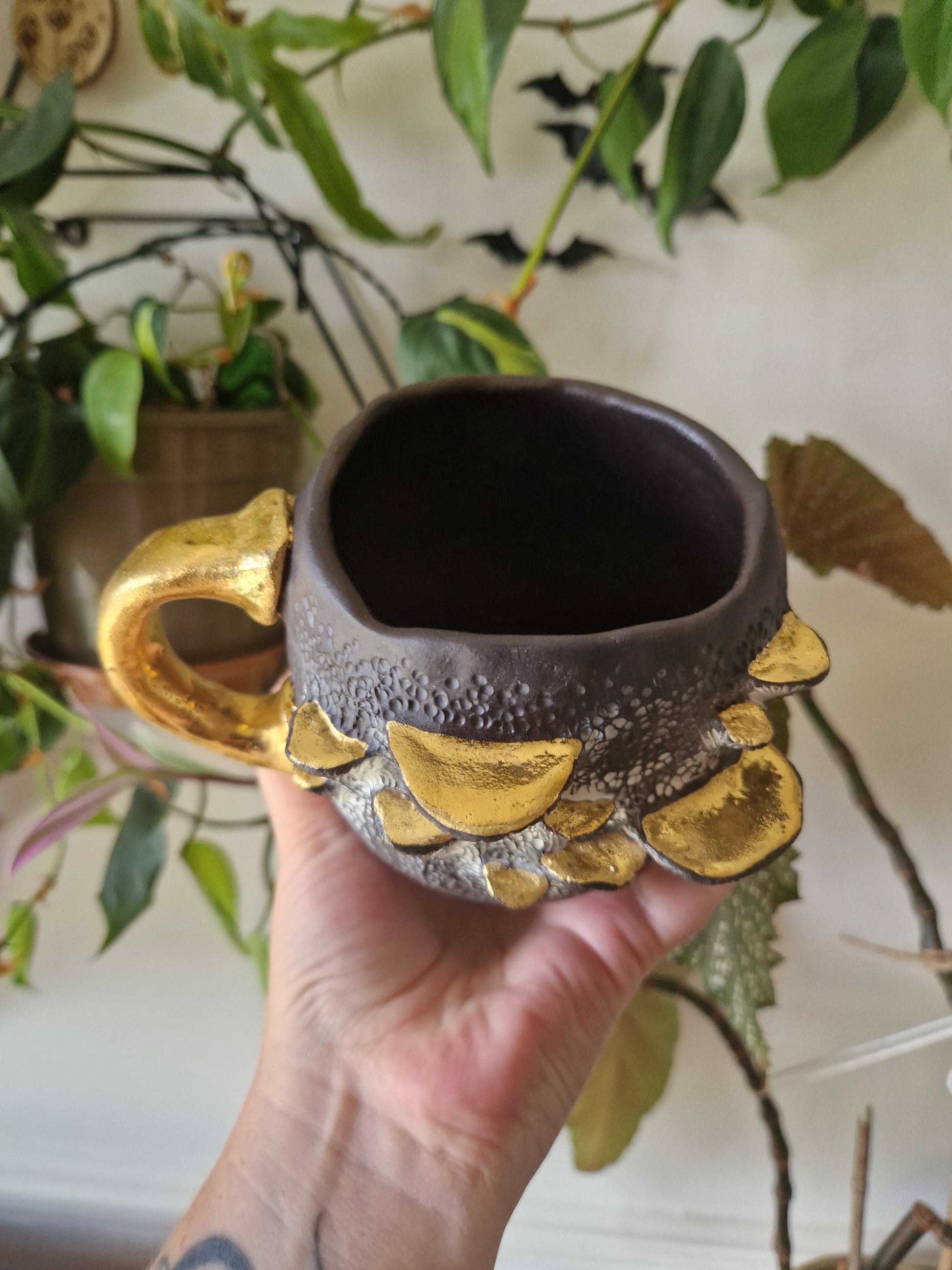 • Hand-made 14oz (Approx.) Mug with Bracket Fungus details, highlighted with white to create an antiqued and dusty effect, clear glaze inside and high-fired to 1260°c and finished with 22k gold luster •