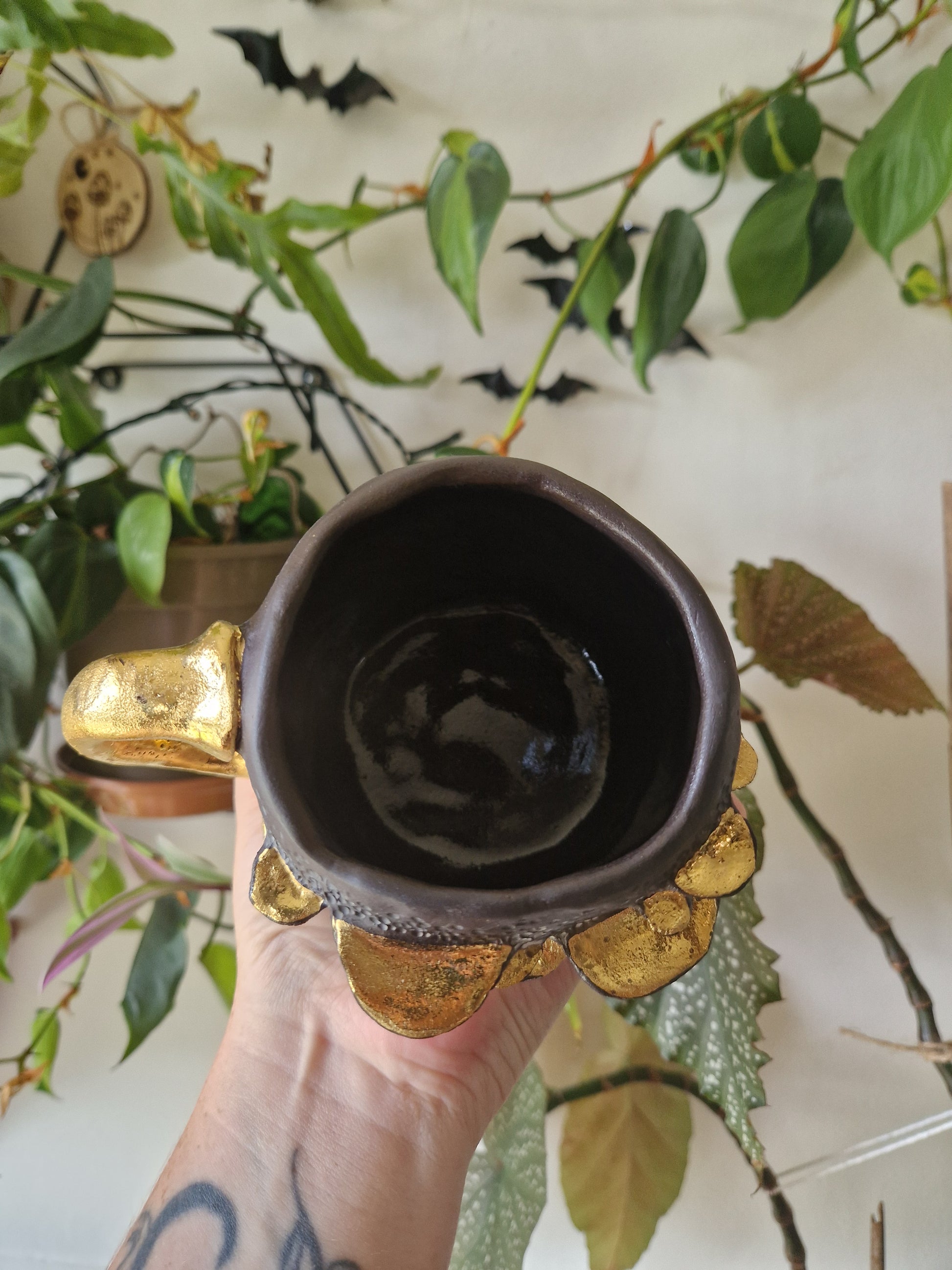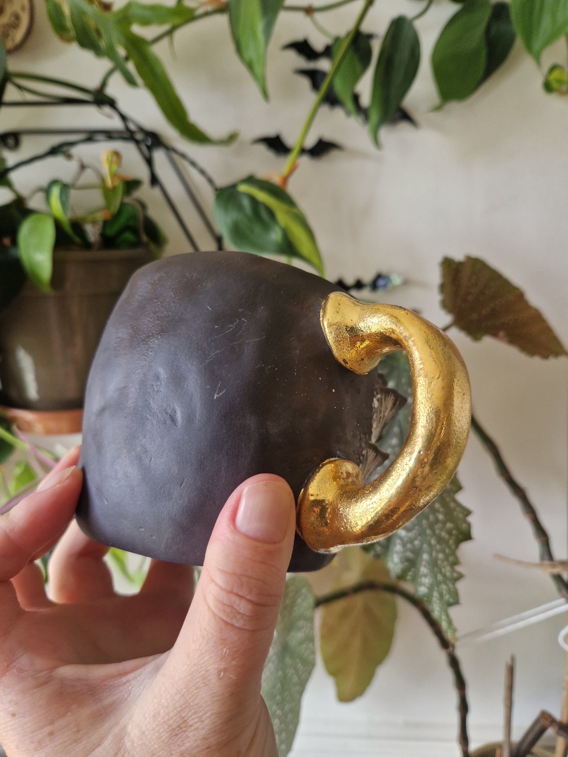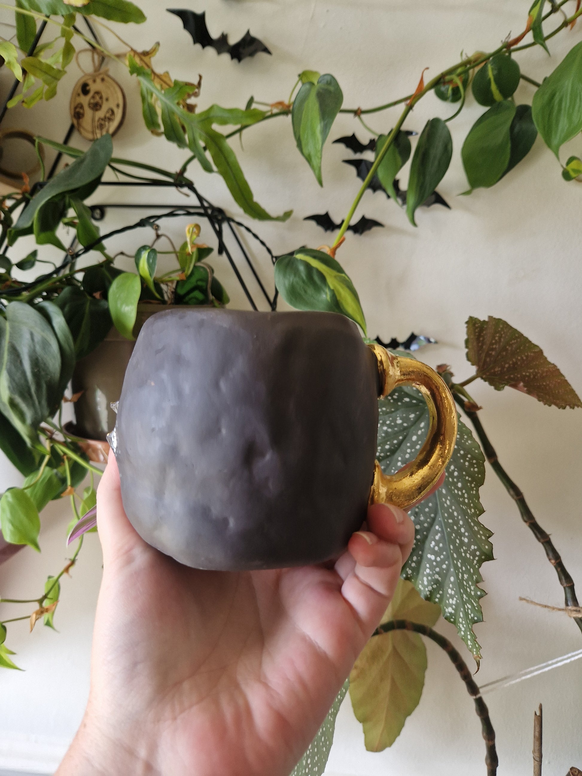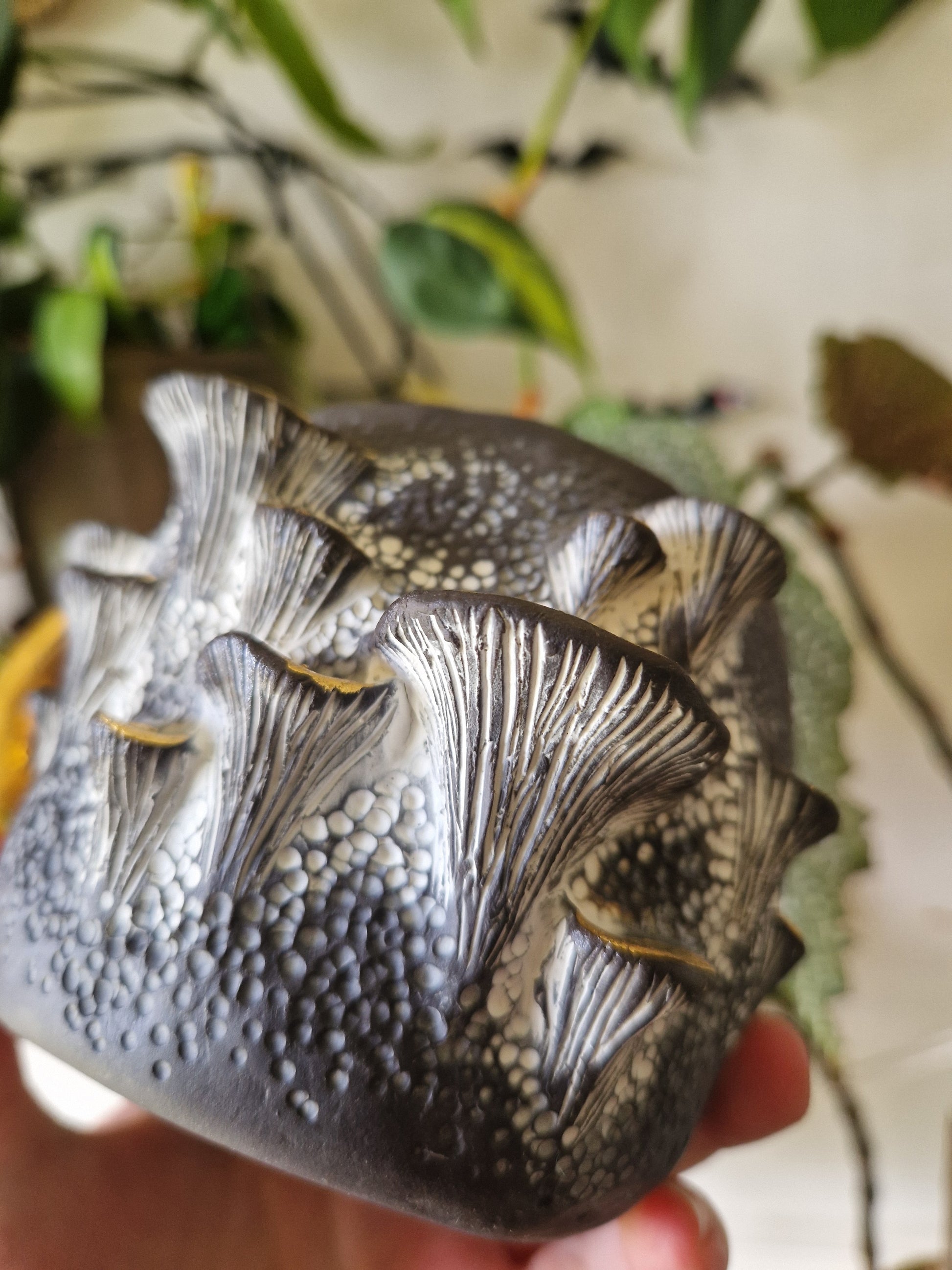 • Hand-made 14oz (Approx.) Mug with Bracket Fungus details, highlighted with white to create an antiqued and dusty effect, clear glaze inside and high-fired to 1260°c and finished with 22k gold luster •
